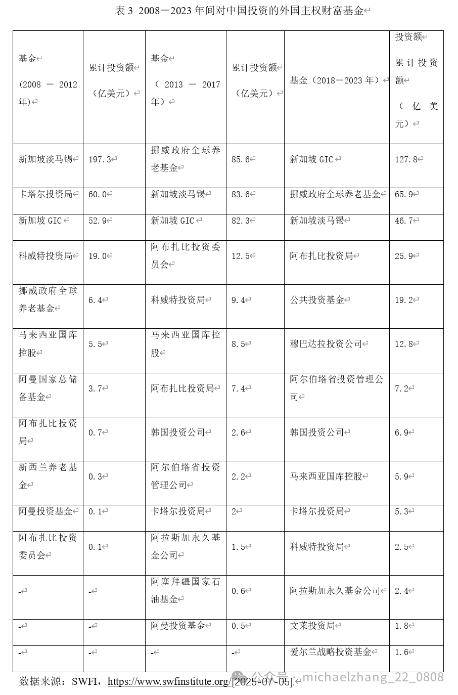 2008-2023年间,对中国累计投资最多的外国主权财富基金母国主要集中在新加坡、挪威、卡塔尔、阿联酋和科威特(见表3)。