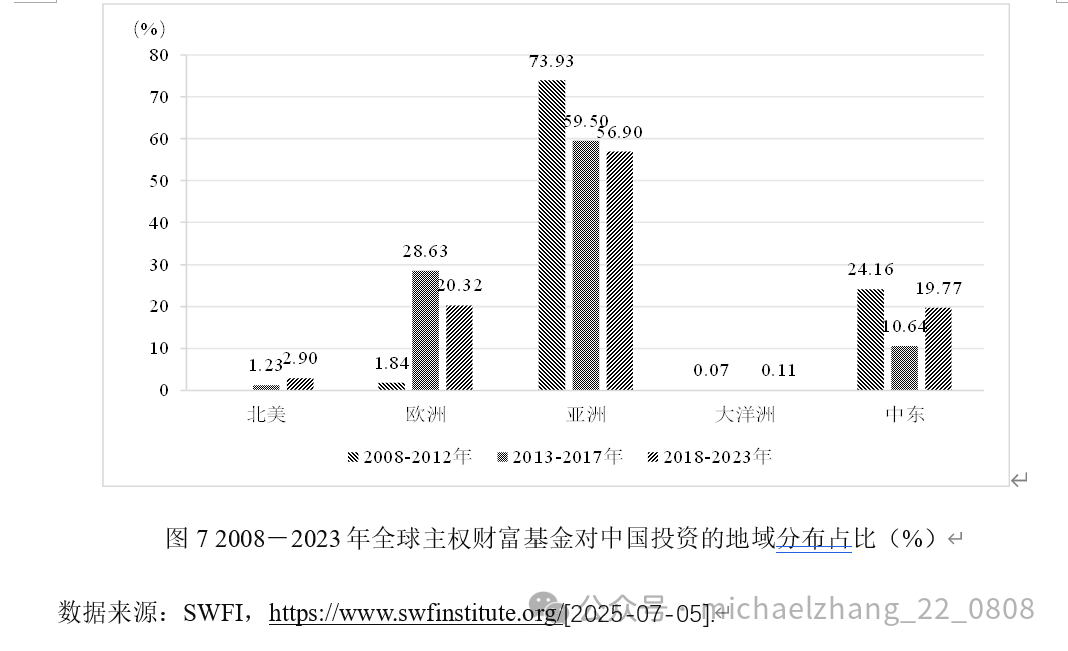 2008-2023年期间全球主权财富基金对中国投资的地域分布中,亚洲地区对中国投资占据绝对比例,投资主要来自于新加坡淡马锡和GIC,此外,马来西亚的主权基金也进行了部分投资;欧洲地区对中国的投资主要来自于挪威GPFG;中东地区对中国的投资主要来自于海湾地区主权基金;北美地区基金从2014年才开始对中国投资;大洋洲地区基金在2013-2017年未对中国投资;非洲和拉丁美洲地区基金未对中国投资(见图7)。由此可见,主权财富基金对中国的投资来源是非常集中的。2018-2023年,相对于欧洲地区和亚洲地区投资占比呈现下降趋势,中东地区主权财富基金对中国的投资占比明显增加,中东地区基金是未来值得重点关注的投资来源主体。