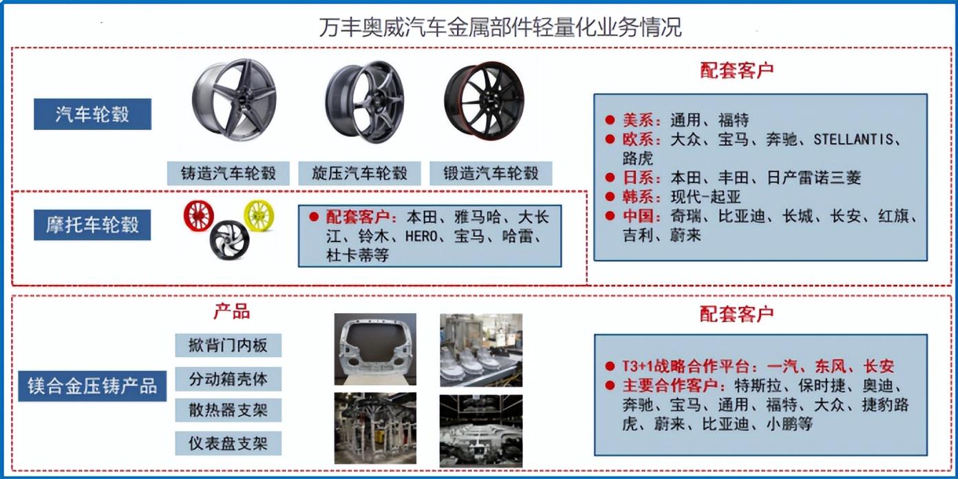 万丰奥威最开始就是给车子做铝合金轮毂的,后面又延伸至摩托车轮毂和镁合金压铸产品,这就是它报表上的汽车轻量化业务。