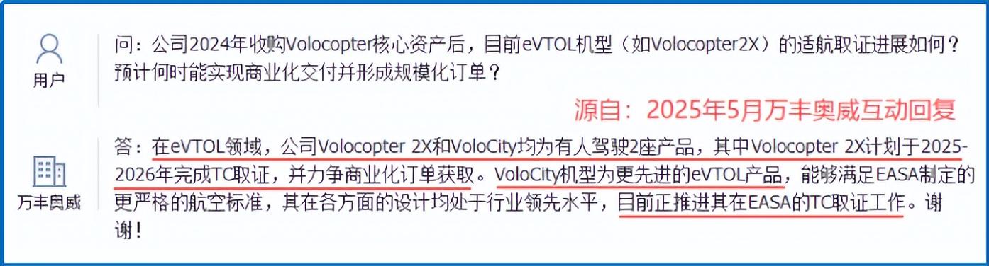 适航认证是eVTOL从实验室走向市场的“入场券”,也是最耗时间和资源的环节。万丰奥威在收购Volocopter后,加速推进机型取证。