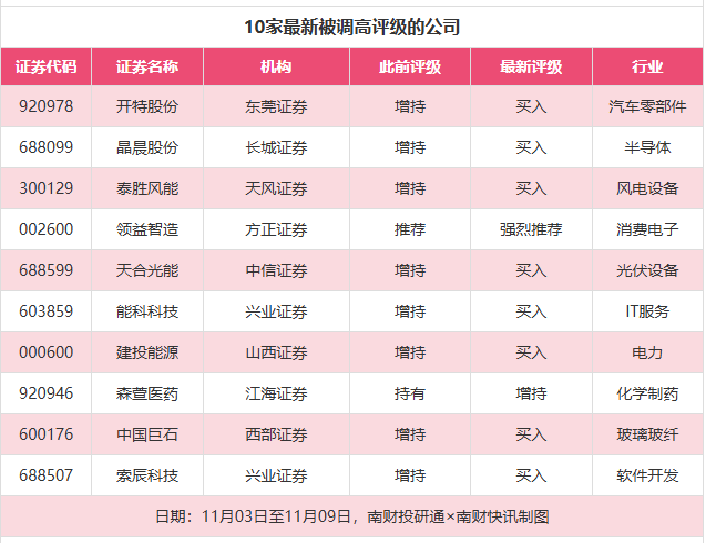 评级调高方面,11月3日至11月9日,券商调高上市公司评级达到17家次,最新数据包括了东莞证券对开特股份的评级、长城证券对晶晨股份的评级、天风证券对泰胜风能的评级均从“增持”调高至“买入”。