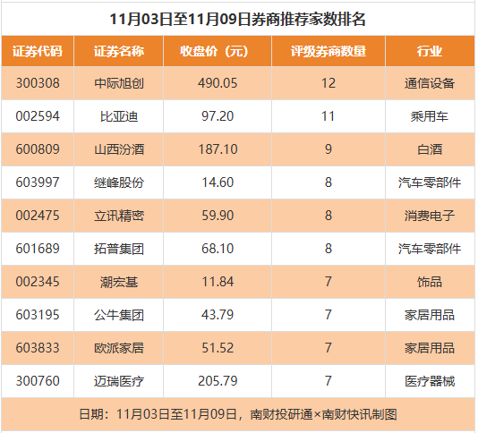 从券商推荐家数来看,11月3日至11月9日有1023家上市公司得到券商推荐,其中中际旭创获得12家推荐,比亚迪获得11家推荐,山西汾酒获得9家推荐。
