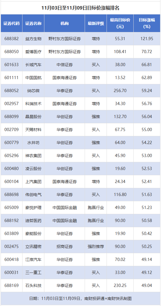 南财投研通数据显示,11月3日至11月9日,券商给予上市公司目标价共423次,按最新收盘价计算,目标价涨幅排名居前的公司有益方生物、爱博医疗、长城汽车,目标价涨幅分别为121.95%、70.72%、66.81%,分别属于化学制药、医疗器械、乘用车行业。