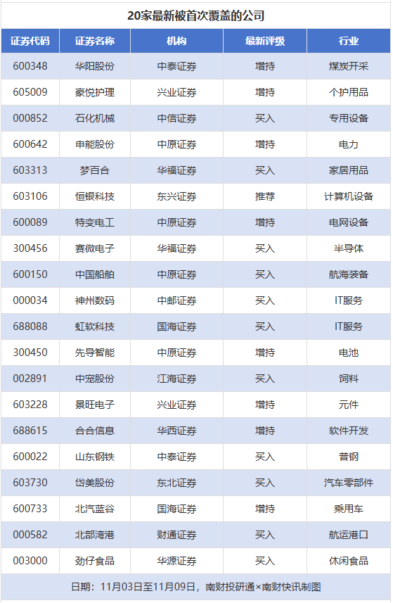 首次覆盖方面,11月3日至11月9日券商共给出了72次首次覆盖,其中华阳股份获得中泰证券给予“增持”评级,豪悦护理获得兴业证券给予“增持”评级,石化机械获得中信证券给予“买入”评级,申能股份获得中原证券给予“增持”评级,梦百合获得华福证券给予“买入”评级。