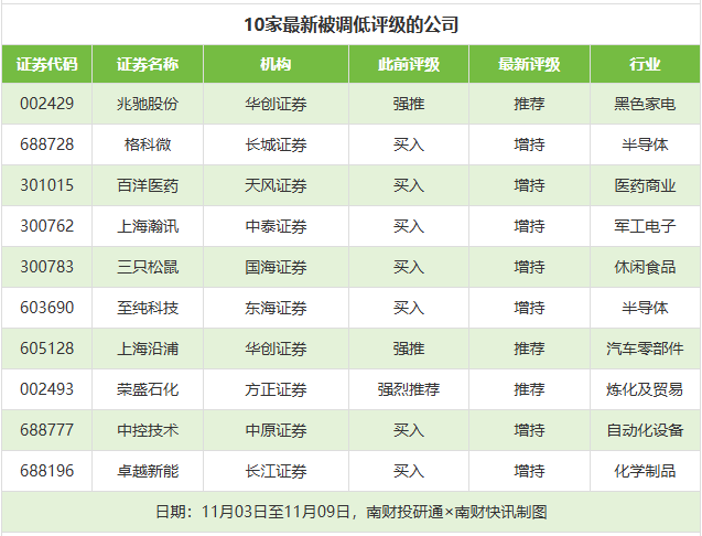 评级调低方面,11月3日至11月9日,券商调低上市公司评级达到17家次,最新数据包括了华创证券对兆驰股份的评级从“强推”调低至“推荐”,长城证券对格科微的评级从“买入”调低至“增持”。