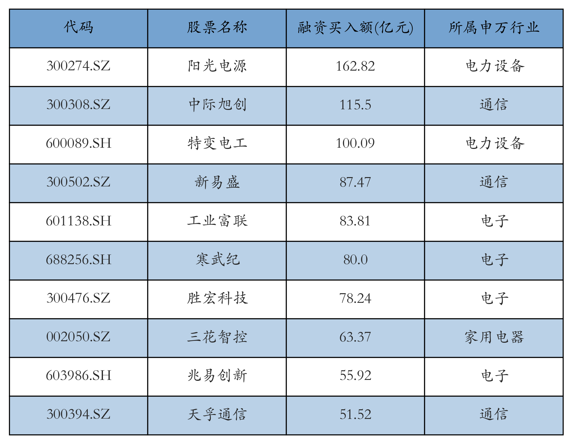 上周两市共有3460只个股有融资资金买入,共有178只个股买入金额超10亿元,其中阳光电源、中际旭创、特变电工排名前三,买入金额分别162.82亿元、115.5亿元、100.09亿元。融资买入额前10个股详情见下表: