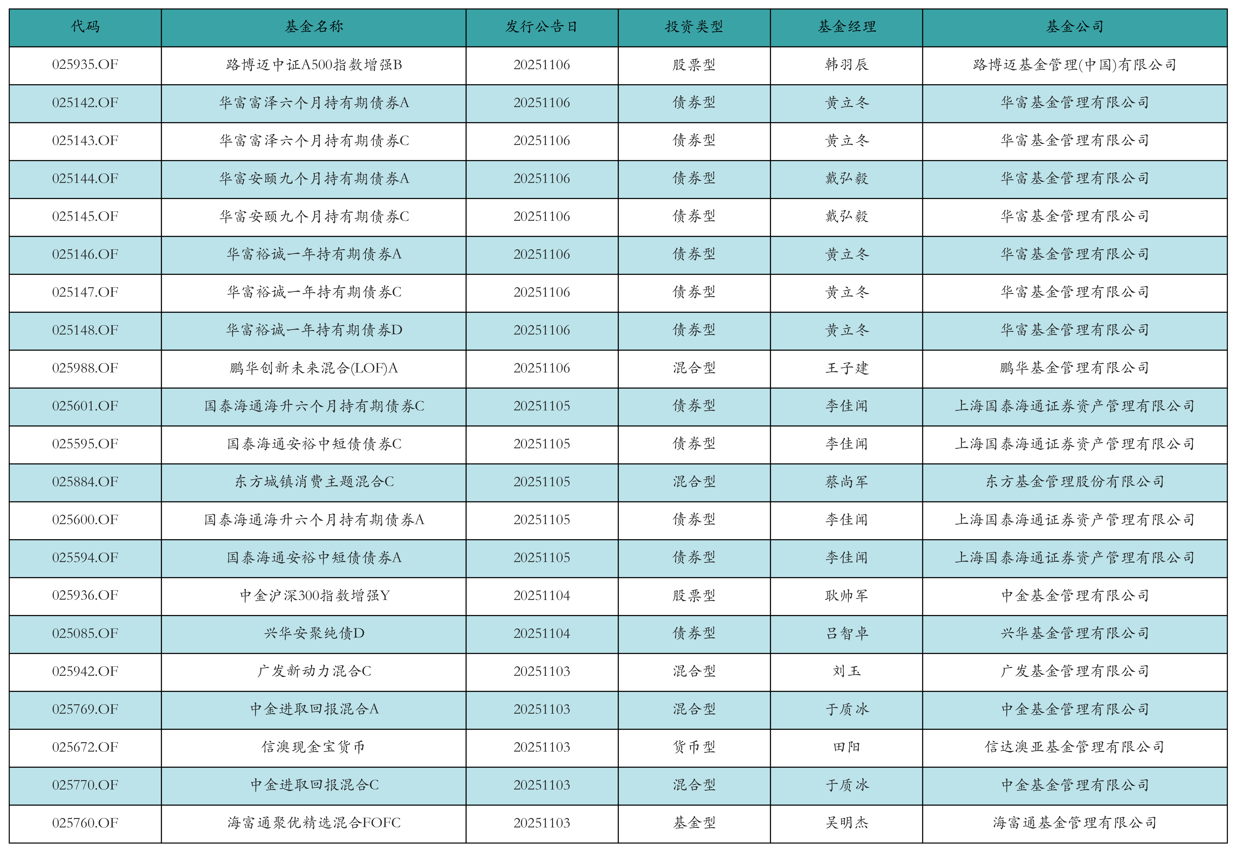 上周有21只新基金发行,分别为:路博迈中证A500指数增强B、华富富泽六个月持有期债券A、华富富泽六个月持有期债券C、华富安颐九个月持有期债券A、华富安颐九个月持有期债券C、华富裕诚一年持有期债券A、华富裕诚一年持有期债券C、华富裕诚一年持有期债券D、鹏华创新未来混合(LOF)A、国泰海通海升六个月持有期债券C、国泰海通安裕中短债债券C、东方城镇消费主题混合C、国泰海通海升六个月持有期债券A、国泰海通安裕中短债债券A、中金沪深300指数增强Y、兴华安聚纯债D、广发新动力混合C、中金进取回报混合A、信澳现金宝货币、中金进取回报混合C、海富通聚优精选混合FOFC,详情见下表:
