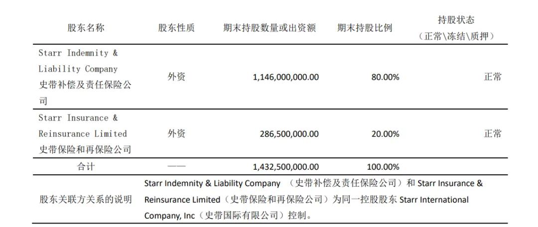 目前,公司共有两位外资股东,分别是史带补偿及责任保险公司,持股80%;史带保险和再保险公司,持股20%。且这家外资均由史带国际有限公司(Starr International Company,Inc)统一控股,也因此成为史带财险的唯一实际控制人。