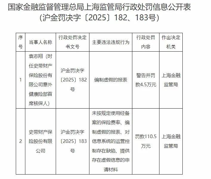11月6日,国家金融监督管理总局上海监管局发布的行政处罚信息显示,史带财险因“未按规定使用经备案的保险费率、编制虚假的报表、对信息系统的运营控制存在缺陷、提供存在虚假信息的申请材料”的违规行为,被罚款110.5万元。