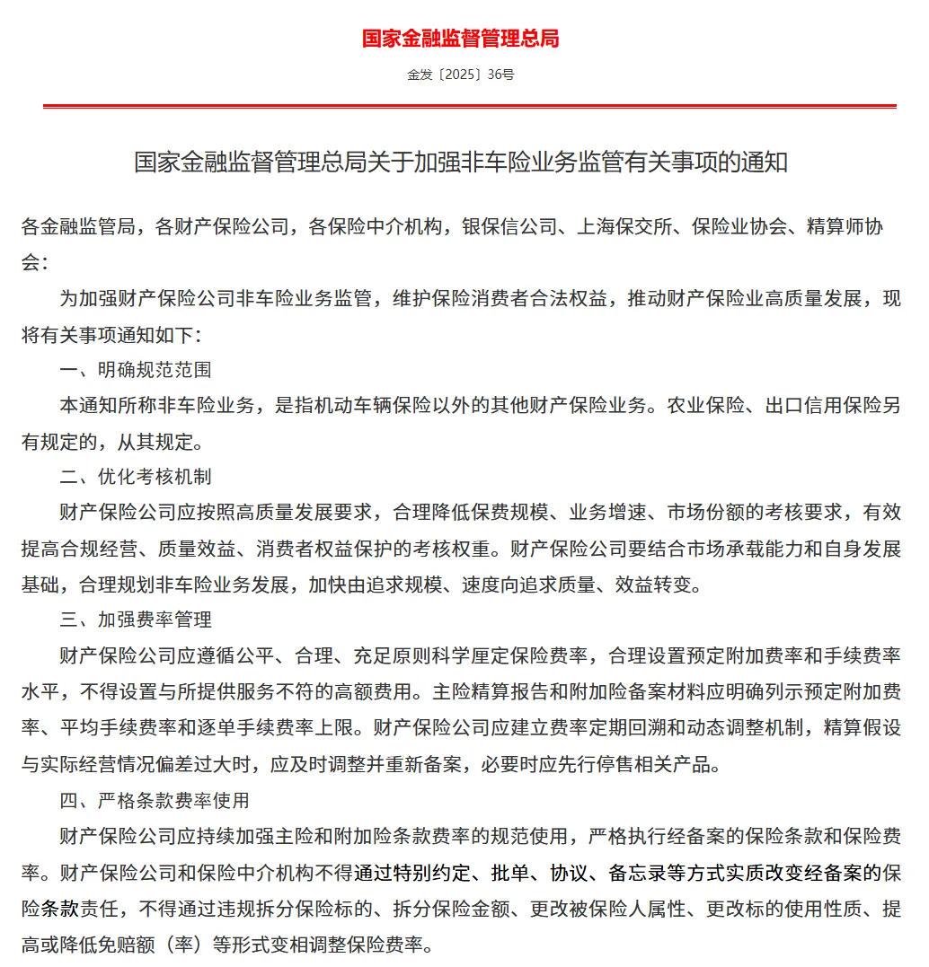 然而,就在公司完成外资独资化转型不久,监管政策的加码进一步抬高了其经营难度。11月1日,金融监管总局《关于加强非车险业务监管有关事项的通知》(下称《通知》)正式实施,明确提出非车险业务“报行合一”等刚性要求,即产品费率与备案标准须保持一致,不得变相打折或变通执行,这较大程度上压缩了险企在定价策略上的弹性空间。