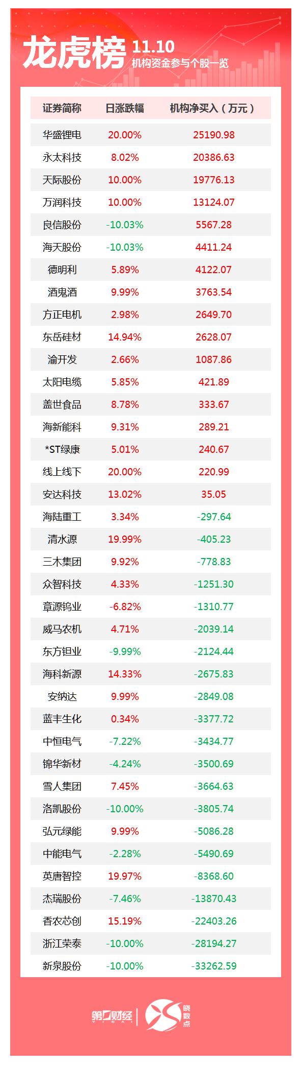 当天机构净买入前三的股票分别是华盛锂电、永太科技、天际股份,净买入金额分别是2.52亿元、2.04亿元、1.98亿元。