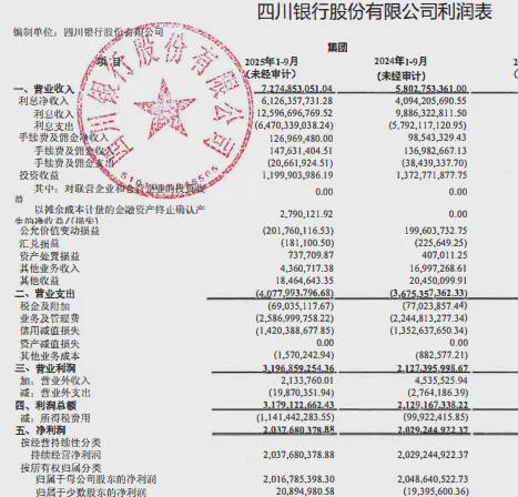 再看四川银行,2025年前三季度实现营收72.75亿元,同比增加14.72亿元,增幅24.74%,其中利息净收入61.26亿元,同比增幅49.63%,说明其传统基本盘比较韧性强劲;净利润同比微增0.41%至20.38亿元,较以往严重放缓。