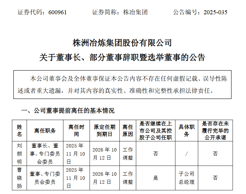 具体来看,株冶集团称,近日,公司董事会收到刘朗明、曹晓扬的书面辞职报告,由于工作调整原因,刘朗明向公司申请辞去董事长、董事、专门委员会委员职务,曹晓扬向公司申请辞去董事、专门委员会委员职务。截至本公告披露日,刘朗明、曹晓扬未持有公司股份。