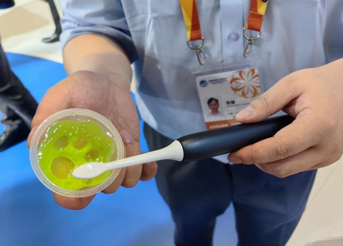 飞利浦展台工作人员展示为改善老年人牙龈健康设计的护敏牙刷。唐小丽摄