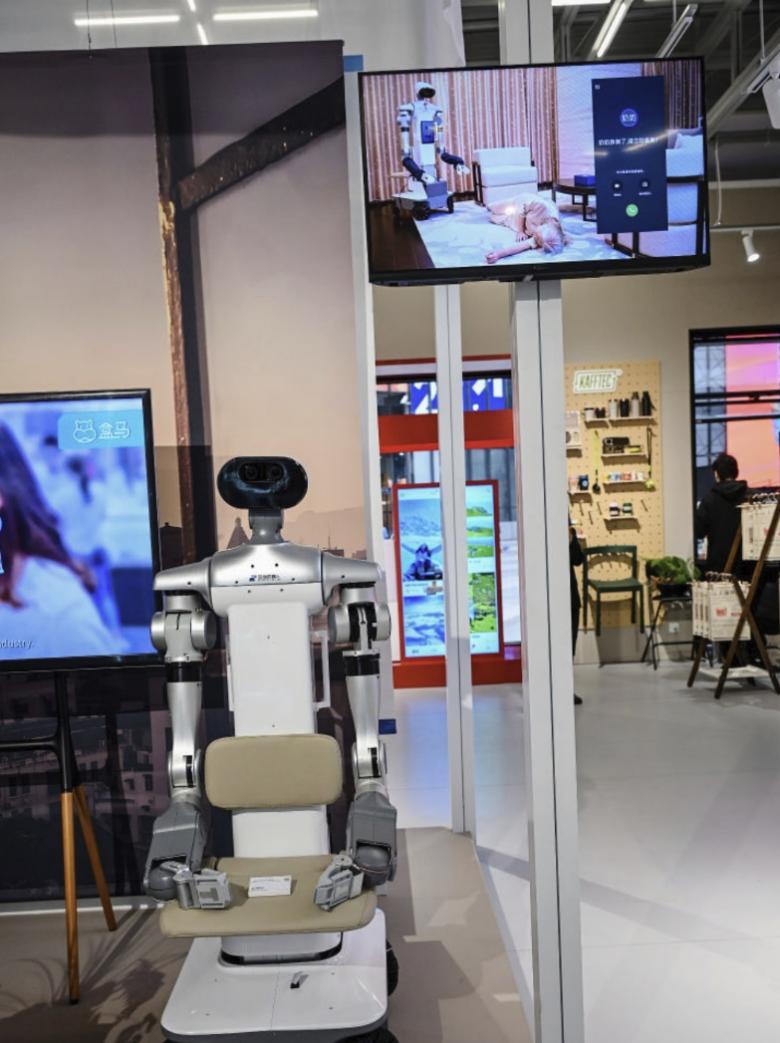 陪伴型适老机器人,是广受关注的新亮点。在上海馆展区,身高约1.7米的养老护理机器人,可以在机器人与轮椅模式之间灵活切换。记者看到,其在机器人形态下,可以完成喂饭、打扫、物品拿取与互动陪伴等工作;在轮椅形态下,可以成为“智能座驾”陪伴出行。