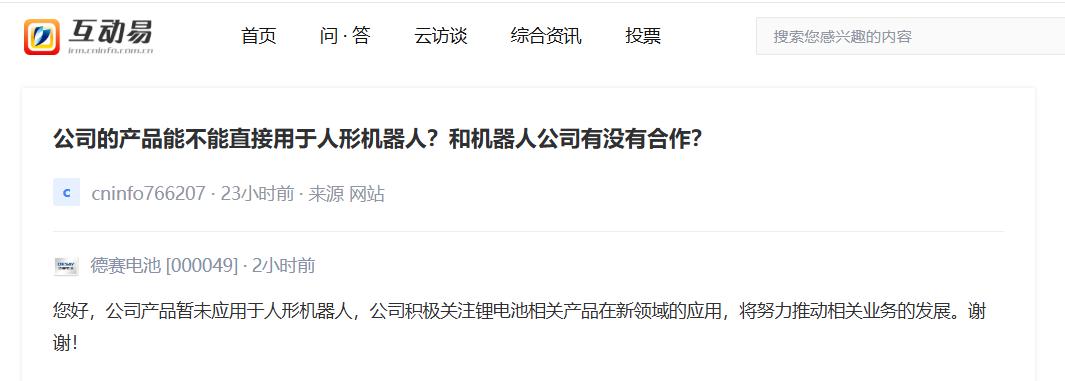 【V观财报丨德赛电池:产品暂未应用于人形机器人】德赛电池11日通过深交所互动易平台回答投资者提问称,公司产品暂未应用于人形机器人,公司积极关注锂电池相关产品在新领域的应用,将努力推动相关业务的发展。(中新经纬APP)