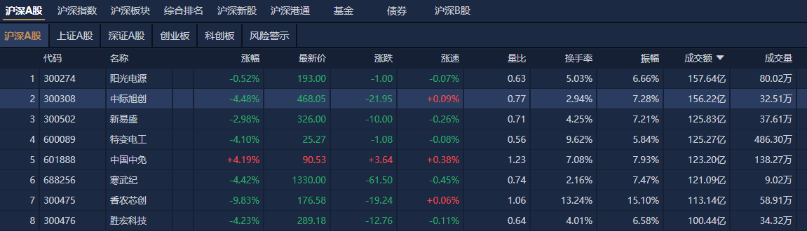 阳光电源成交额居首,为157.64亿元。其后是中际旭创、新易盛、特变电工、中国中免,成交额分别为156.22亿元、125.83亿元、125.27亿元、123.2亿元。