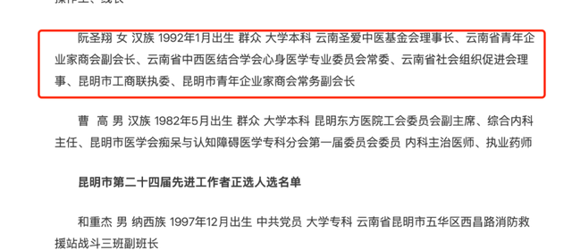 2023年末,她以“云南圣爱中医基金会理事长”身份出现在昆明市劳动模范公示名单中;2024年,又以“圣爱中医集团副董事长”身份出席集团2024年工作总结暨2025年工作规划大会,发布公司年度战略。