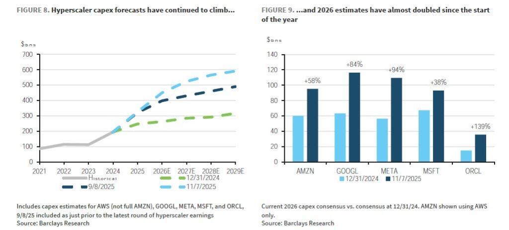 (左图:超大规模数据中心的资本支出预测持续上升;右图:今年年初以来,2026年的预测数值几乎翻了一番)