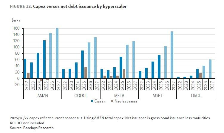 巴克莱认为,这并非一次性现象。随着AI竞赛升温,资本支出预测和融资需求预计将持续增长。虽然短期内发行速度可能放缓,但“更长时间、更高水平”的债务发行将成为新常态。