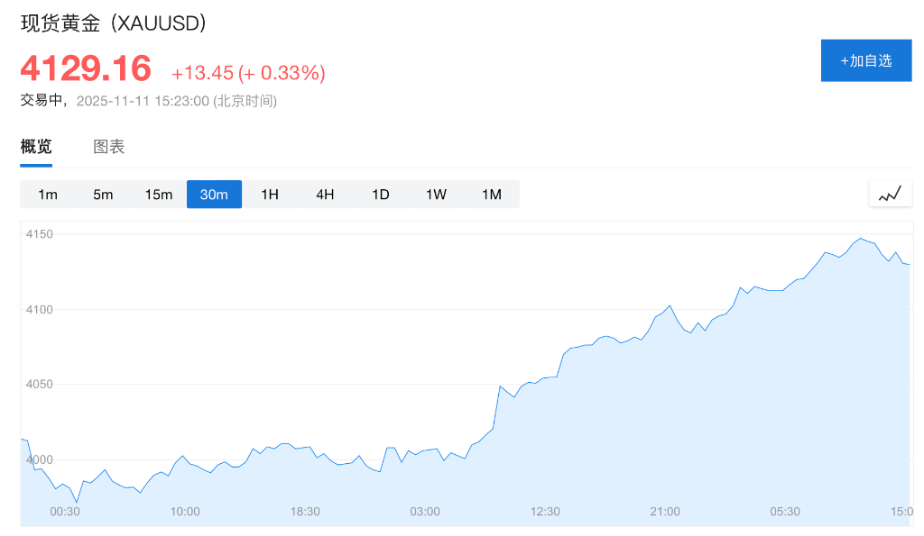 现货黄金涨超0.3%,再度突破4100美元/盎司。