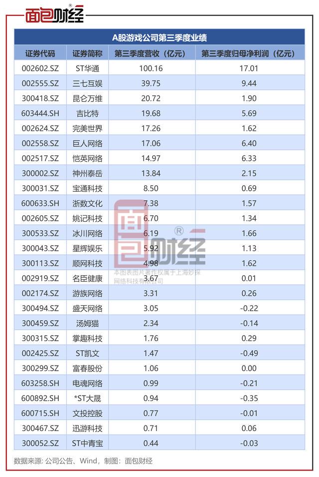 ST华通、三七互娱、吉比特、巨人网络等公司第三季度业绩领跑。其中,吉比特、巨人网络第三季度收入同比增长超过100%。