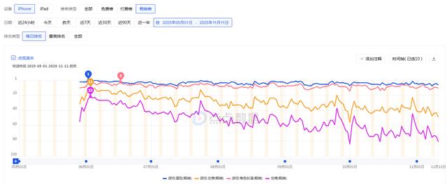 根据全球移动应用、游戏数据监测服务商点点数据的监测,《杖剑传说》大陆版于2025年5月上线,截至11月11日仍位居中国内地iOS游戏畅销榜前50名。