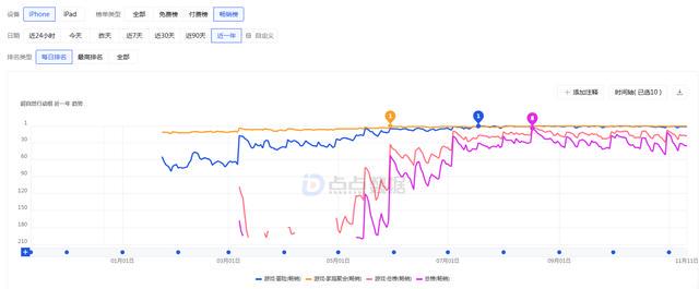 巨人网络业绩增长则受益于旗下游戏《超自然行动组》的强势表现。根据点点数据的监测,《超自然行动组》在中国内地iOS游戏畅销榜排名持续走高。
