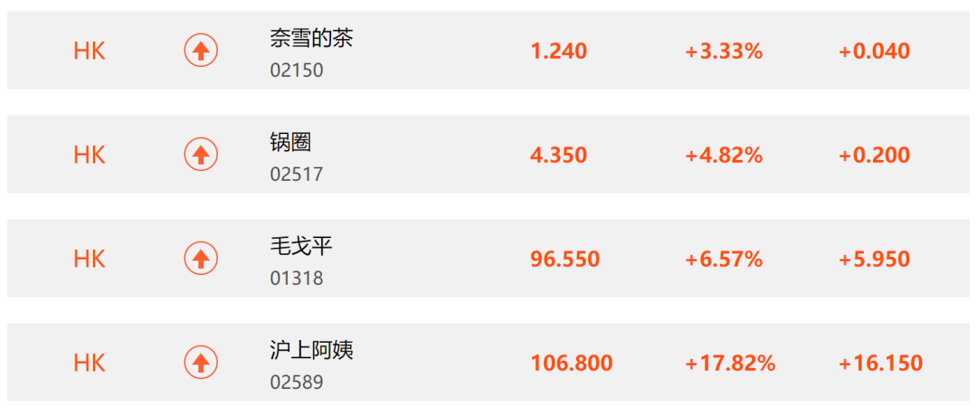 11月12日早盘,港股新消费概念股持续活跃。截至10:07,沪上阿姨涨逾17%,锅圈涨逾4%,毛戈平涨逾6%,奈雪的茶涨3.33%。
