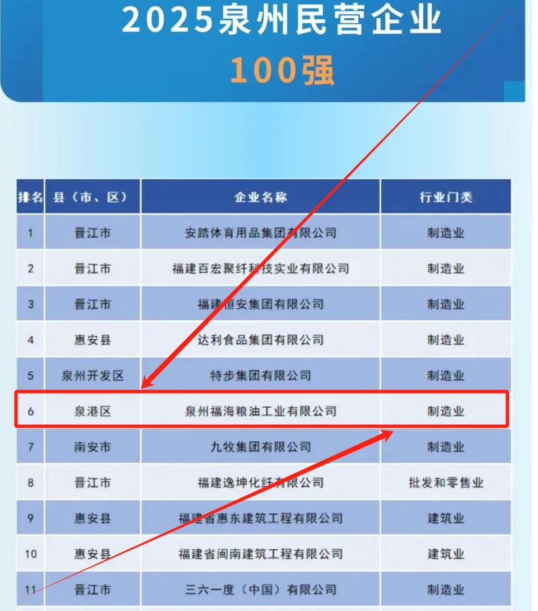 2025年11月,泉州民营企业100强榜单如期发布。在这份竞争激烈的榜单上,安踏集团以708.26亿元的营收蝉联榜首,成为泉州民企的领头羊。在这份榜单上,一家粮油企业以其稳健的表现引人注目——泉州福海粮油工业有限公司以128.4亿元的营收位列榜单第6位,稳坐泉州泉港区民企的头把交椅。