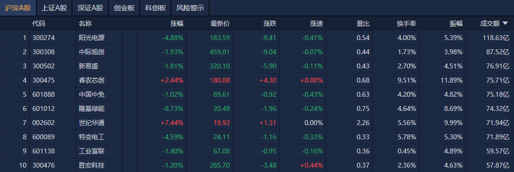 个股方面,阳光电源成交额超118亿元居首,中际旭创、新易盛、香农芯创成交额靠前。