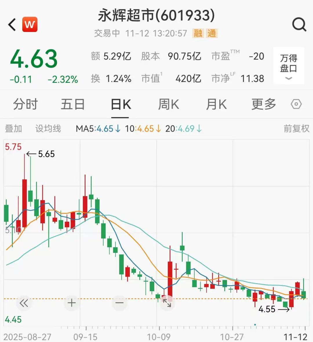截至11月12日发稿,永辉超市报收4.63元/股,跌2.32%。