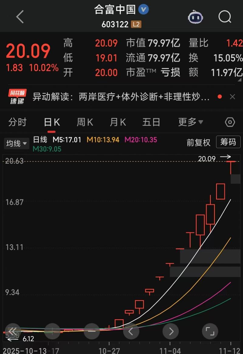 11月12日,合富中国(603122.SZ)再度涨停,在12个交易日内斩获11个涨停板,仅1日短暂断板后便火速回封,股价从10月27日的6元区间一路飙升至12日收盘价20.09元/股,累计涨幅高达173.35%,总市值逼近80亿元,成为当前市场最受瞩目的连板“龙头股”。