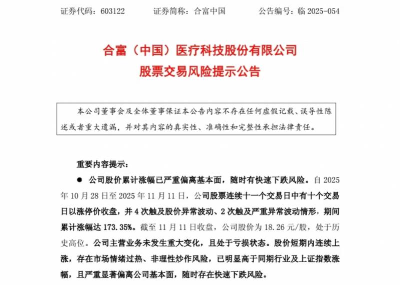 面对股价连续上涨,合富中国已多次发布风险提示公告。自10月28日行情启动以来,公司累计4次触发股价异常波动、2次提示严重异常波动,明确提醒投资者“股价泡沫化、严重偏离基本面”,随时存在快速下跌风险。