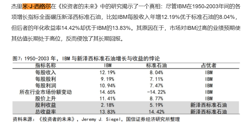 国信证券在一篇研报中引用投资大师杰里米·J·西格尔的研究指出,高增长并不必然带来高回报,过高的估值反而会侵蚀长期收益。