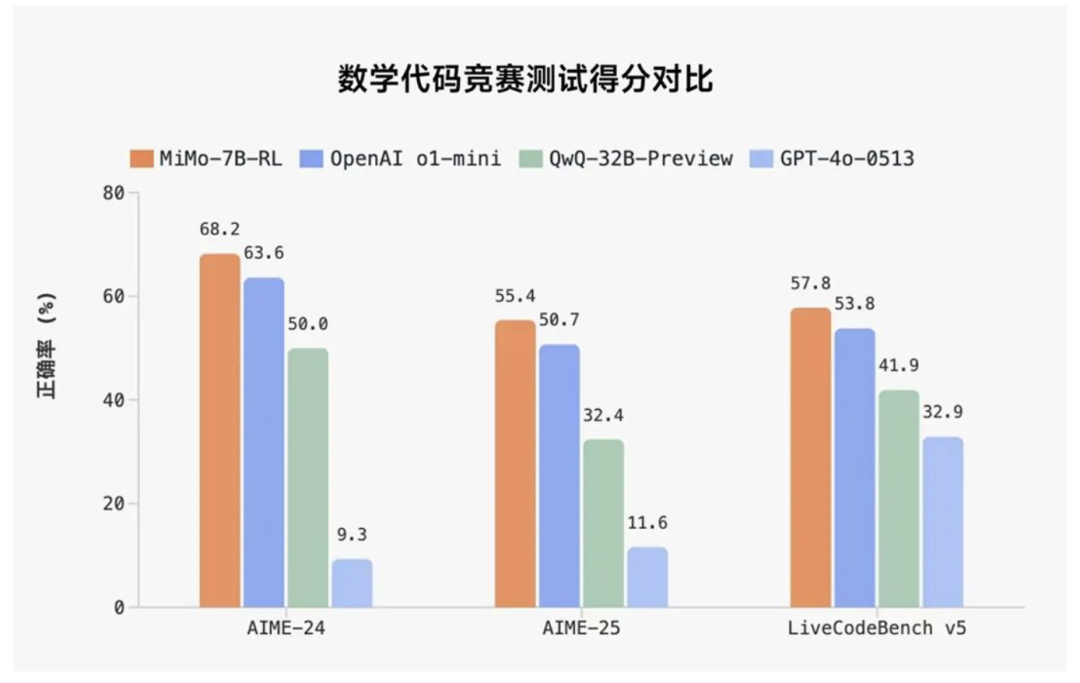 文章称,在数学推理(AIME 24-25)和代码竞赛(LiveCodeBench v5)公开测评集上,MiMo仅用7B的参数规模,超越了OpenAI的闭源推理模型o1-mini和阿里Qwen更大规模的开源推理模型 QwQ-32B-Preview。