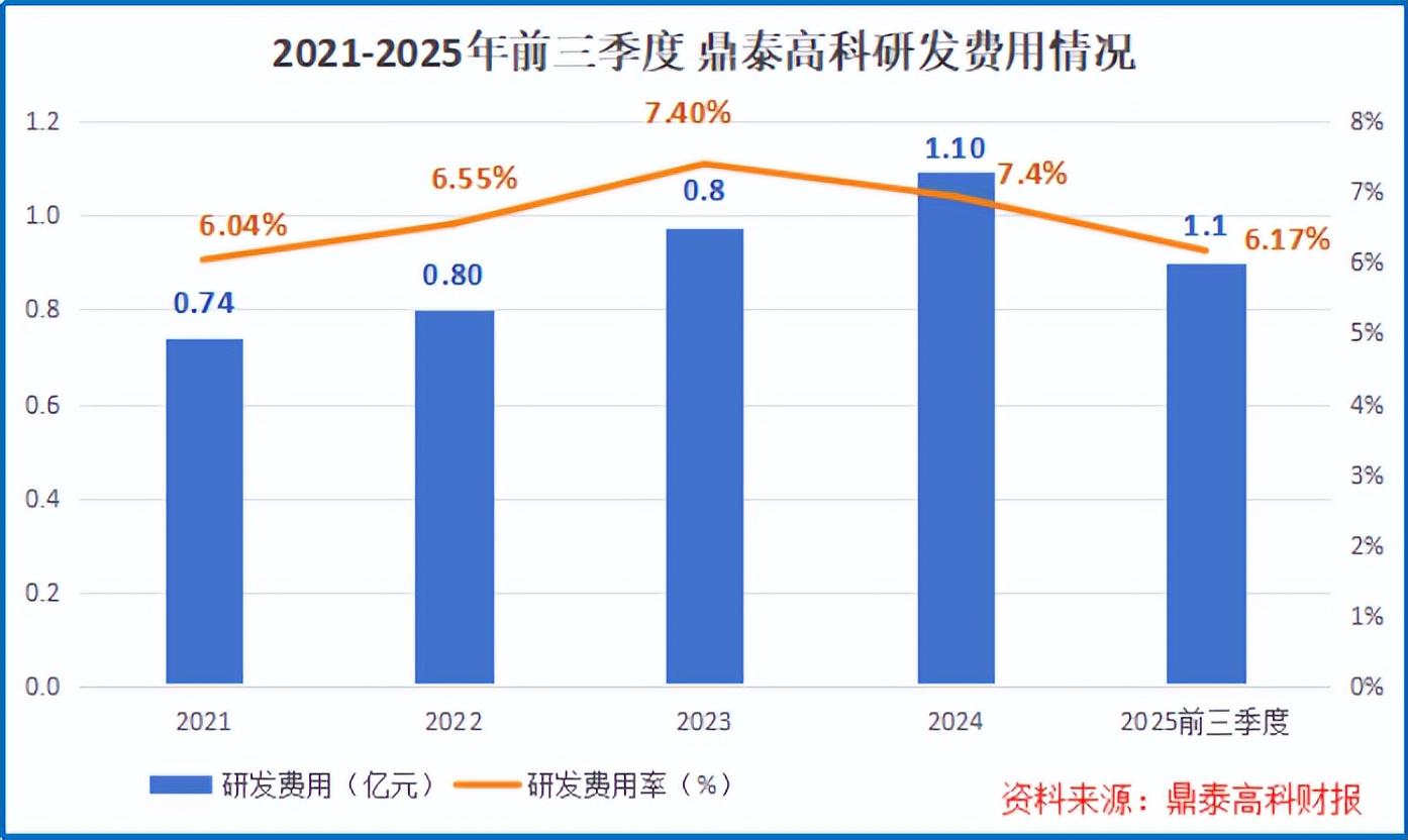 面对技术难题,鼎泰高科常年保持高研发投入,2021-2025年前三季度研发费用占比持续高于6%,领先尖点科技(4%左右)等主要竞争对手。
