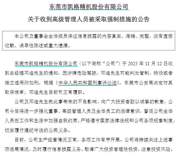 凯格精机12日公告,收到总经理邓迪的通知,因涉嫌危险驾驶,邓迪可能判处管制、拘役或者独立适用附加刑,根据《中华人民共和国刑事诉讼法》,东莞市公安局决定对其取保候审,邓迪目前可正常履职。