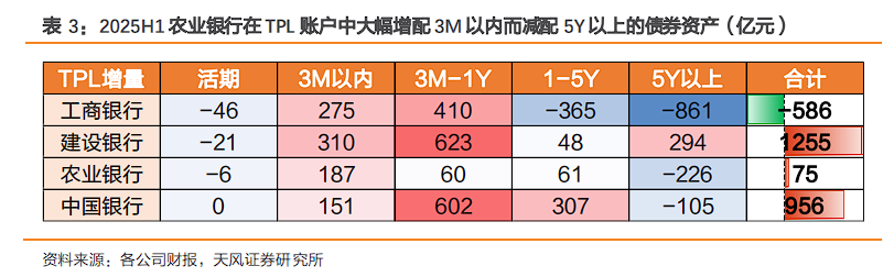 第二,农业银行在TPL账户债券资产的摆布中采取了"控久期"策略。2025年上半年,农业银行新增TPL账户债券资产的期限结构中,3个月以内增加187亿元,而5年以上减少226亿元。这有助于降低公允价值大幅负向波动的风险,在一季度债市大幅调整期间将潜在浮亏控制在较低水平。