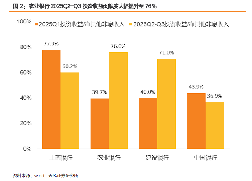 同时,2025年一季度至三季度,农业银行投资收益占营收比重分别为3.8%、6.3%、6.2%,显示出较强的盈利诉求。