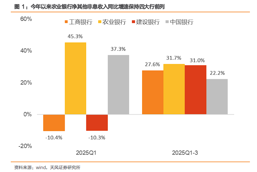 从财报数据来看,2025年前三季度农业银行净其他非息收入同比增长31.7%,领先于建设银行的31.0%、工商银行的27.6%和中国银行的22.2%。特别值得注意的是,在一季度工商银行、建设银行净其他非息收入显著负增长的情况下,农业银行甚至逆势高增45.3%。