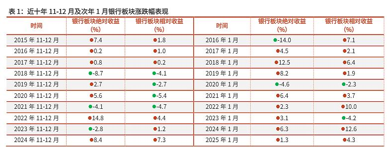 从更宏观的视角来看,光大证券研究发现,银行板块在11月至次年1月进入季节性"顺风期",历史数据显示该时段绝对收益概率高达70%-80%。