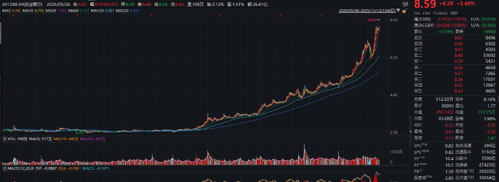 11月12日,农业银行股价一度涨超4%,总市值首次突破3万亿元,再创历史新高。自8月上旬首次问鼎A股流通市值冠军以来,农业银行股价持续攀升,年内涨幅已达68%。9月4日,农业银行(A股+H股)总市值强劲攀升,成功超越工商银行,成为新的“宇宙行”。