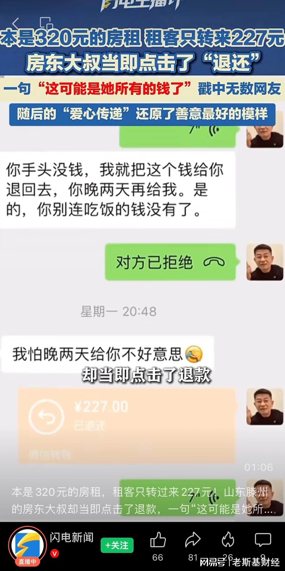 看着这一个有零有整的三位数,房东大叔意识到这可能是姑娘微信里所有的钱了,他点了退款。他想的是: