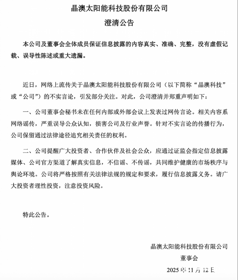 当天收盘后,涉事公司晶澳科技同样发布《澄清公告》,否认了相关传闻。称“公司董事会秘书未在任何内部或外部会议上发表过网传言论。相关内容系网络谣传,严重误导公众认知,损害公司及行业声誉。针对不实言论的传播行为,公司保留通过法律途径追究相关责任的权利。”