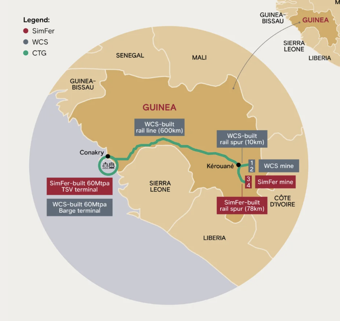 韦立国际称,作为西芒杜项目的核心配套工程,跨几内亚铁路全长约600公里,贯通几内亚东南部西芒杜铁矿区与大西洋沿岸的马瑞巴亚港。该铁路设计年运输能力超过1亿吨,将成为西芒杜铁矿资源输出的“大动脉”。