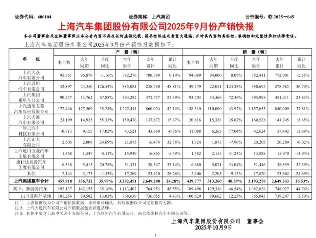 与此同时,上汽集团在2025年9月交出了44万辆的销量成绩,同比大增40.4%,环比增长21%,重回行业榜首。