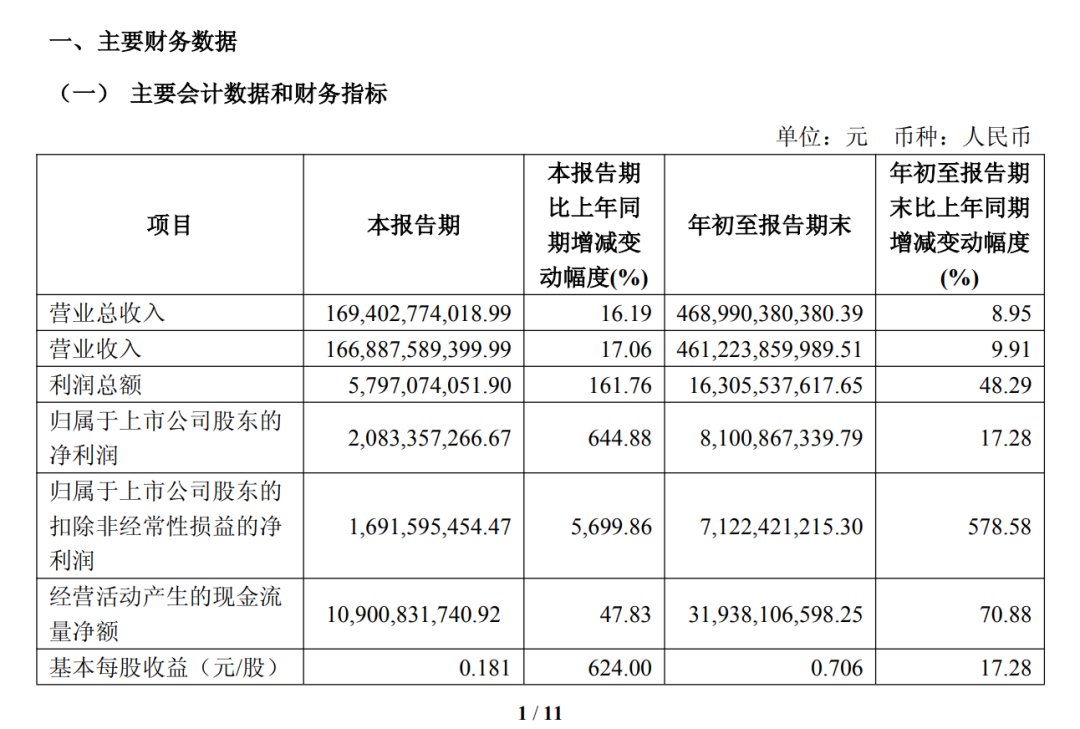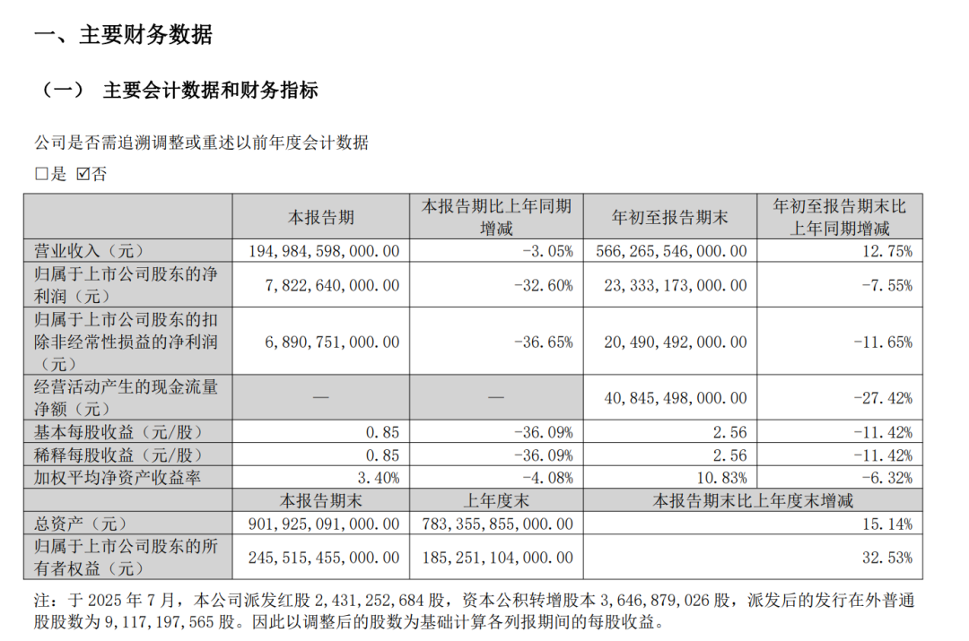 最新财报显示,公司第三季度营业收入1949.85亿元,同比下降3.05%;归母净利润78.23亿元,同比下降32.6%。