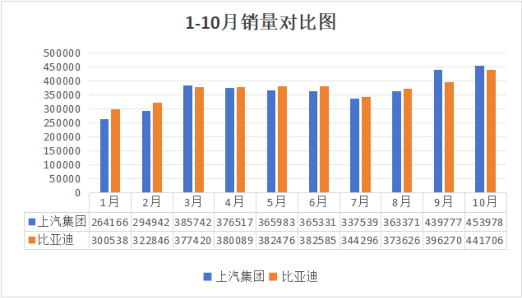 从1-10月的累计数据来看,比亚迪与上汽始终处于你追我赶的胶着状态,整体差距微乎其微。