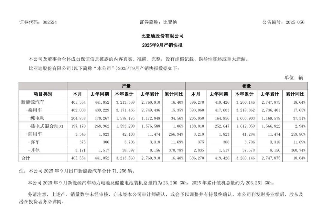 这一财务表现与销量趋势相互印证——比亚迪在9月和10月连续出现销量同比下滑。